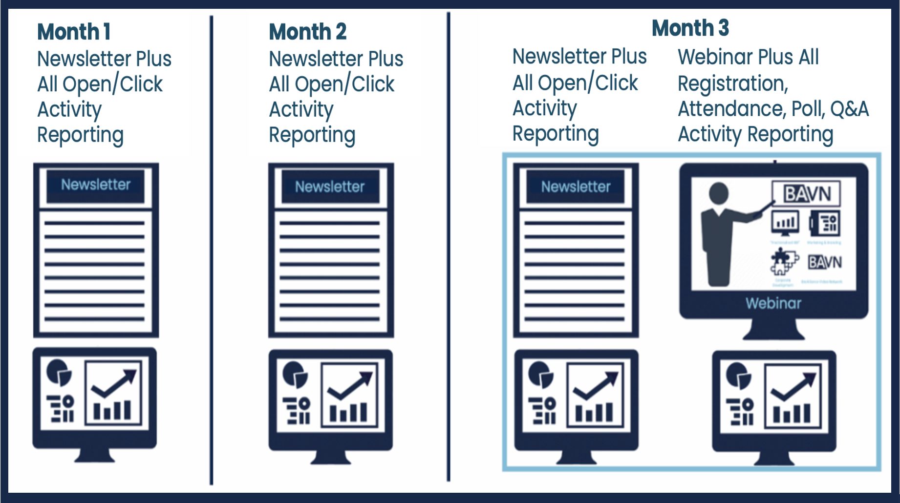 - 3 Monthly Newsletters — Reach a Global Audience with Links to Your Website, Case Studies, White Papers, and Videos. Receive all Open/Click Data to Create Follow-Up Activity for Your BD Team. No More Blind Hunting!