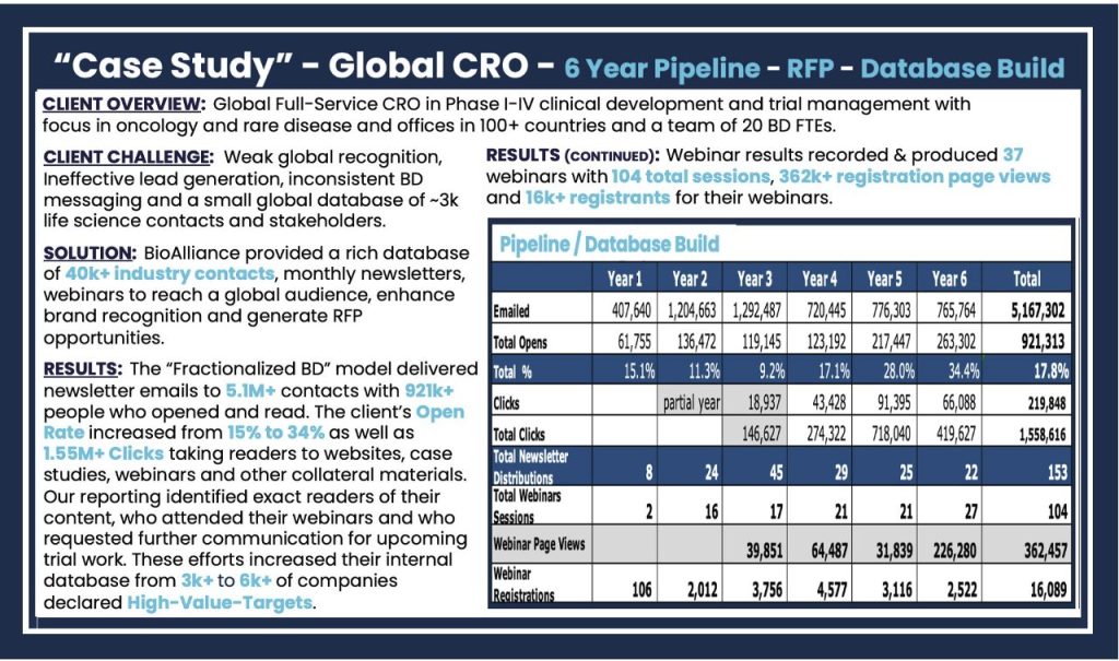 “Working with BioAlliance Strategies is an asset to any company’s outreach efforts. The engaging newsletters, videos, and webinars make a big difference to smaller CROs who need to get targeted messaging about their core competencies. The times I have engaged Jim’s team, and over many years, there are actionable results resulting in RFPs.”