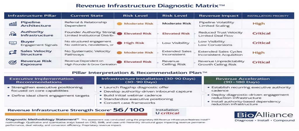The BioAlliance Revenue Infrastructure Diagnostic™ evaluates the infrastructure behind the pipeline to determine whether commercial performance is supported by a structured system or dependent on inconsistent activity.
