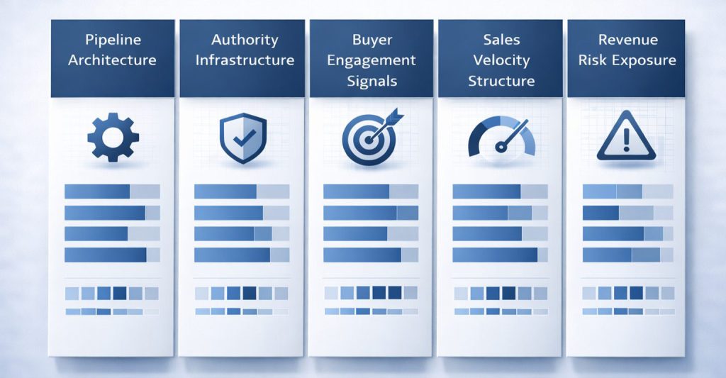 Each diagnostic includes an Overall Revenue Infrastructure Strength Score™, five pillar scoring with explanation, risk observations by pillar, a public market-facing evidence review, install priorities, and a clear view of what is preventing stronger commercial performance.