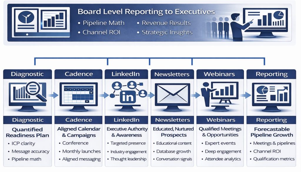 Defines Ideal Client Profile (ICP), clarifies messaging, audits gaps, and quantifies pipeline math so execution starts focused, efficient, and revenue ready.