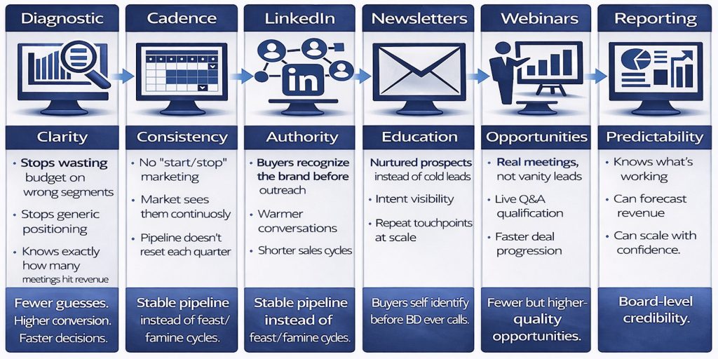Systematically delivers proof, data, and credibility to your market on a consistent cadence so buyers are educated, warmed, and deal ready before your team ever reaches out.